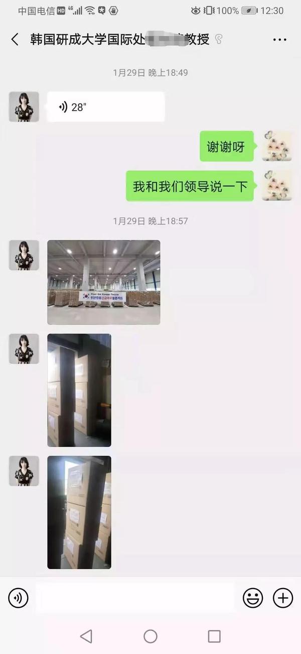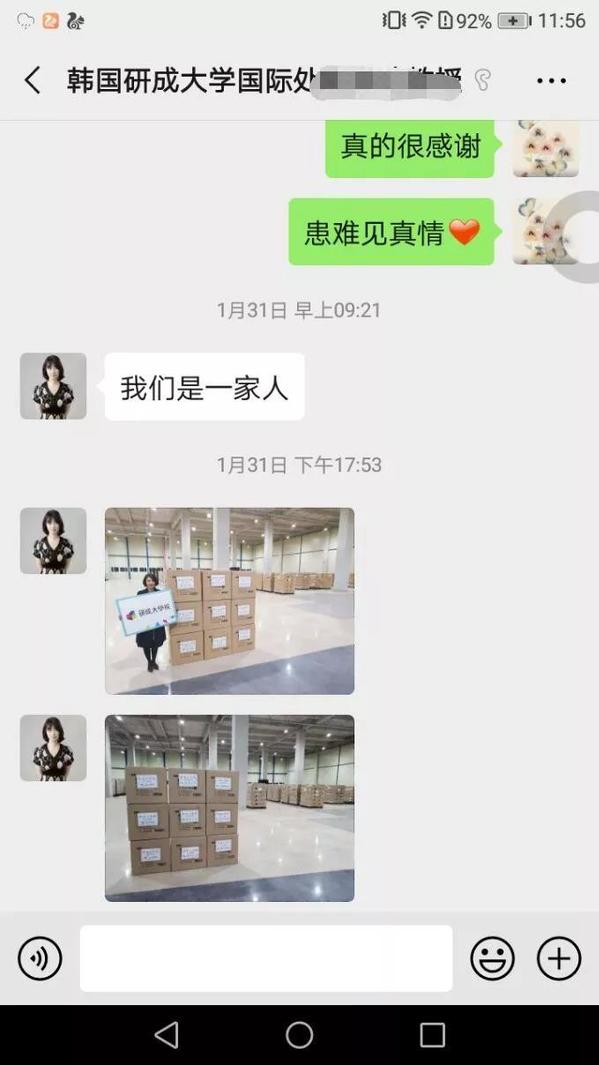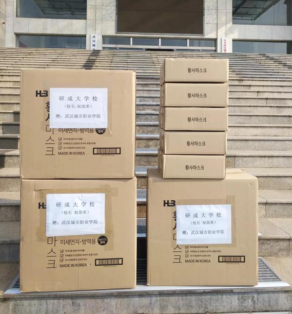 1月29日,当获悉武汉因疫情封城后,韩国研成大学国际合作部负责人崔允瑄教授通过微信方式联系我校国际教育学院负责人,转达了研成大学校长权珉希女士对我校真诚的问候,并提出,了解到目前武汉防疫物资供应困难,研成大学将向我校无偿捐赠一批防疫物资!