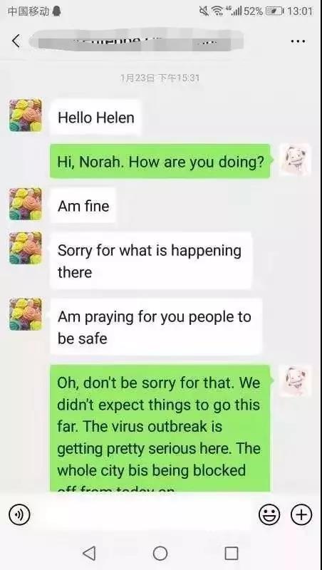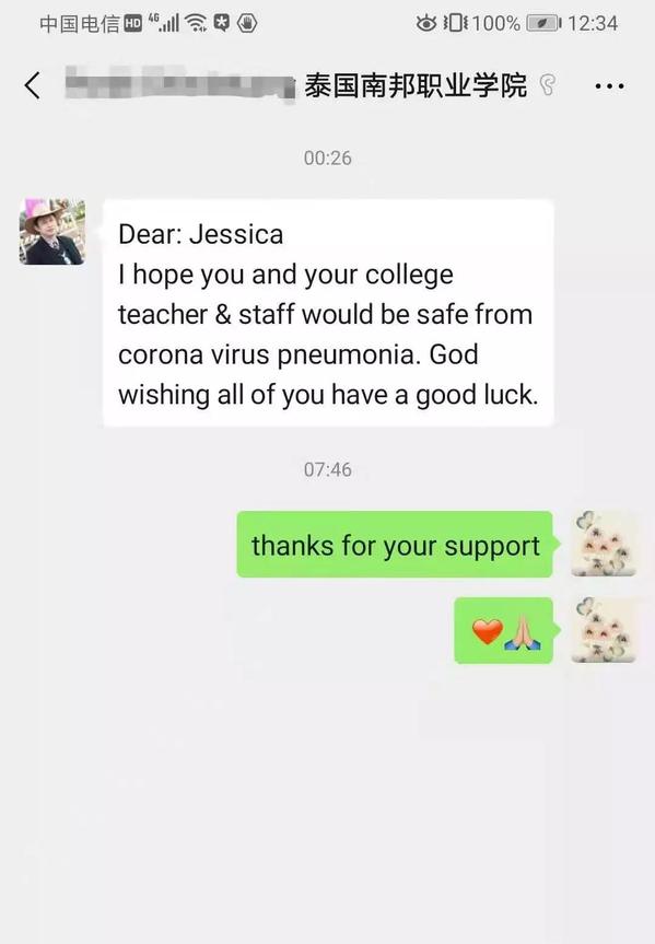 除了研成大学捐献防疫物资外,伊朗伊中友协青年委员穆斯塔法先生、泰国南邦学院校长彭里特先生、“中国武汉-乌干达恩德培职业教育培训项目”参训学员、恩德培市长秘书Norah女士、2018年发展中国家电工培训班学员等纷纷通过微信等方式对我校表达问候,希望武汉早日战胜疫情,祝学校师生平安!