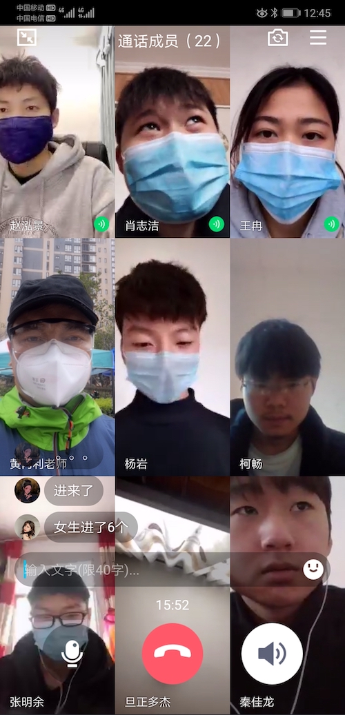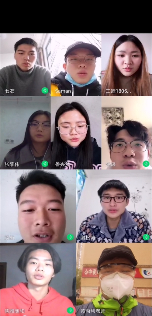 12:30视频主题班会正式开始,正在值守在社区志愿者黄丙利老师连线18级各专业班长和信管1901班全体学生,向大家介绍自己下沉的社区,工作岗位和职责,负责小区”三天一大团两天一小团”团购事宜,满足社区居民的生活需要,为医务家属、空巢老人等弱势群体送爱心菜和药品等任务,同时还要劝返居民散步、遛狗等工作,连续20多天服务居民群众第一线,大家私下都亲切地叫我“勤务兵”。