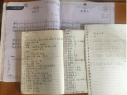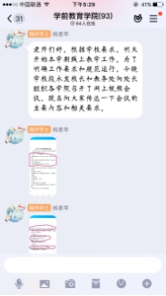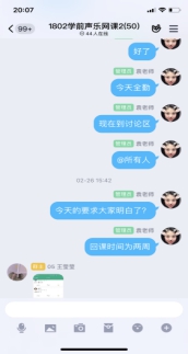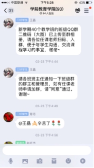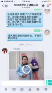 在课堂教学过程中,老师们利用各种平台、各种手段上课,很多技能课程老师不仅要亲身示范,为了关注学生是否掌握,布置一次作业需要花很多时间批阅,还要在线语音辅导、纠错……。幼儿教师口语陶秋兰老师,上课工具就一个手机、一支笔和一个本子,本子上手抄了所有学生的名字当记分册,记录他们朗读中的问题和分数。通过QQ群的“群课堂”、“语音通话”这两个功能进行集体教学和针对性辅导,上下课时间与课表、作息时间一致,不耽误学生其他时间,学习效果很好。