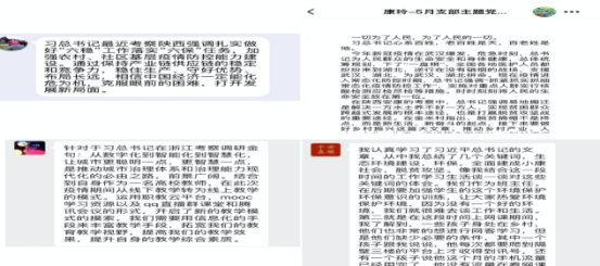 最后,支部书记谢民同志结合自己这段时间的线上教学工作进行总结,特殊时期,教育教学方式应该作出相应地调整,党员同志们要齐心协力,共克时艰。她同时对大家疫情期间的辛苦付出,予以肯定,并提出了殷切期望,她表示:特殊时期,各位党员同志有责任、有担当,无论是抗疫工作还是线上教学,各位同志都体现了自己高度的责任感,