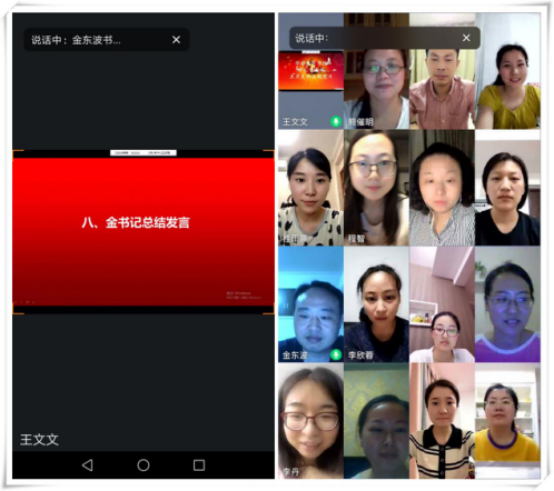 会议最后党总支书记金东波同志做总结发言,他高度肯定了此次线上会议的开展模式与成果,认为支部会议过程庄重严肃、交流发言深入生动,忆初心情真意切、送诤言胸怀坦荡,“N”战疫情形式新颖!同时他也对下一步工作提出了总体要求,要求党员教师们在“疫情防控常态化、工作运行常规化”的要求下,做好线上教育教学以及学生管理工作,创新方法,关心关爱学生。他勉励大家在工作中充分发挥党员先锋模范作用,配合学校做好返校复学各项准备工作,确保学校各项工作全面进入正常化状态。
