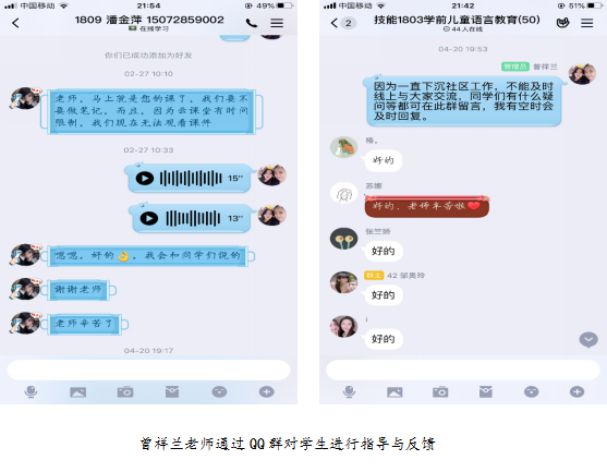 罗智梅老师作为疫情期的志愿者,在下沉社区期间,充分利用云课堂,让学生在家用手机便完成每天上课签到、资源学习、课后作业,将教学重难点进行点对点的讲解,并通过QQ答疑的形式,及时解决学生学习中的困惑。
