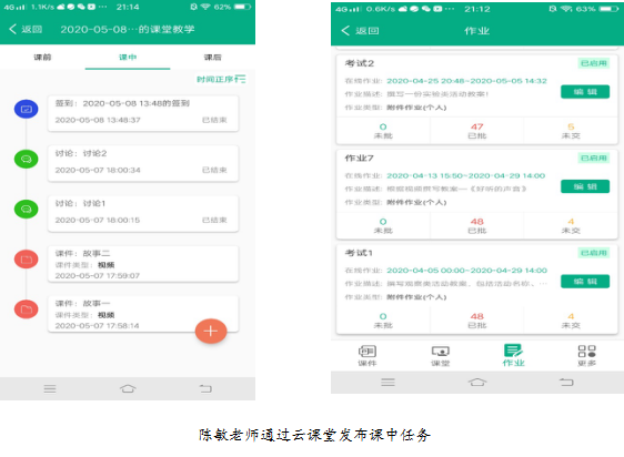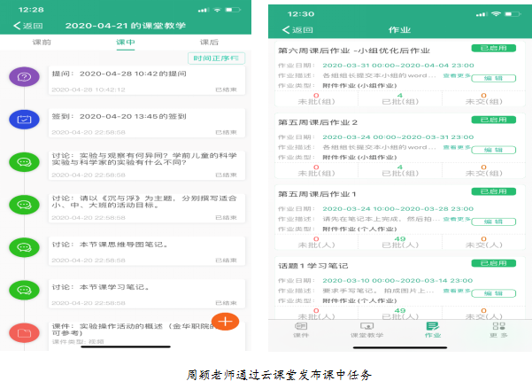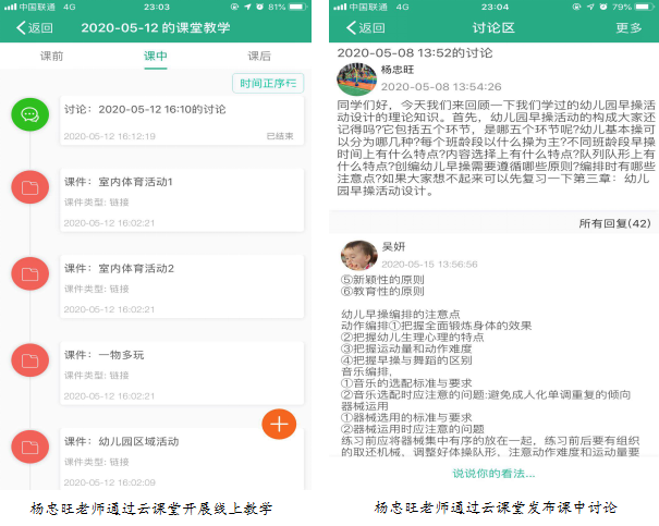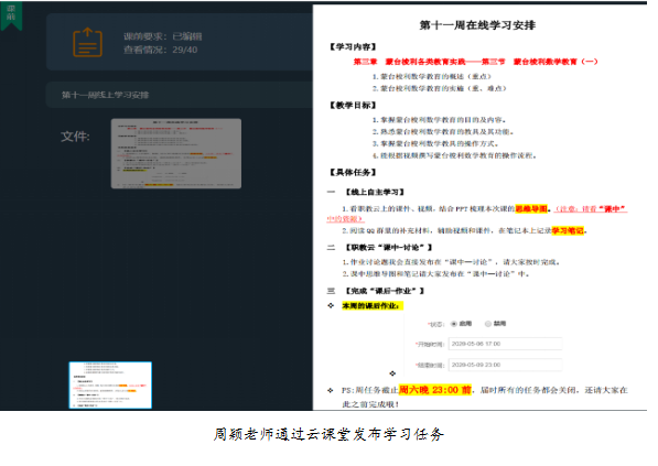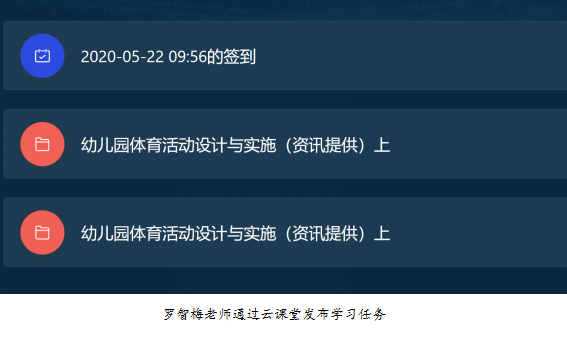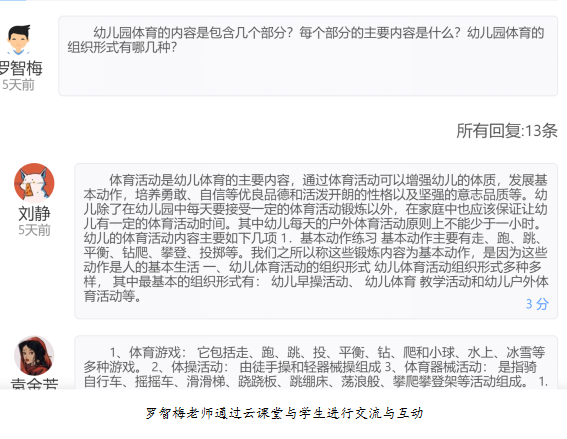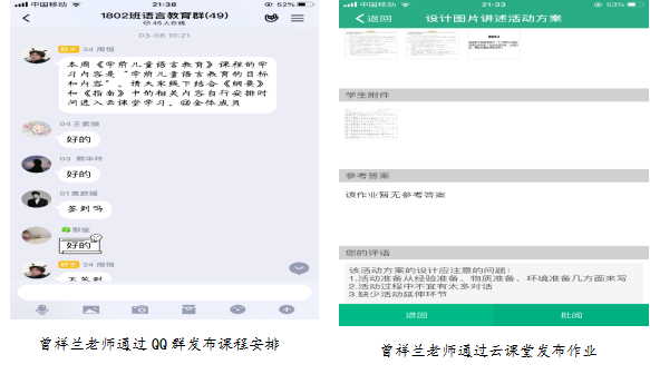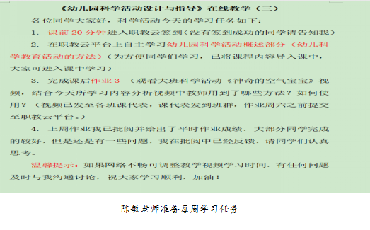 陈敏老师结合《学前儿童语言教育》课程的特点,不断思考线上课程的设计与组织方式。在课程开始之前,陈老师在原有课程资源的基础上,添加了新的ppt课件和线上课程视频!在课程实施钟中,陈老师利用云课堂和QQ相结合的形式,每周按时布置教学任务,组织学生在云课堂上签到、学习课程ppt和教学视频,要求学生积极参加云课堂讨论,回答平台问题,并按时提交作业。通过课后作业批改了解学生掌握情况。同时,对学生学习过程中存着的问题利用QQ群和云课堂进行解答,不断提高教学效率!