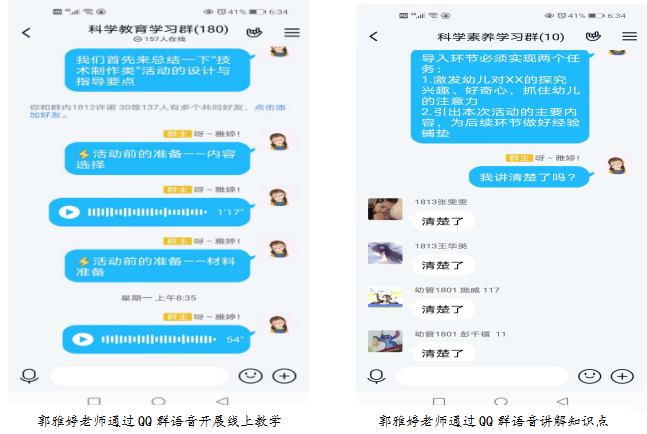 郭雅婷老师作为小区防疫工作的一名“代购员”,他每天不仅仅要忙着劝导外出遛弯的居民,还要一趟又一趟地跑到超市和药店为居民购买生活必需品。在疫情下沉社区期间,郭老师主要采取线上布置学习任务的方式,给学生提供教学活动案例、视频、教材、课件资源,督促学生自学为主,教师在线答疑,QQ群语音讲解重点知识为辅。从社区撤回后,基于前期活动设计理论学习的基础,通过直播的方式对学生进行活动试教的考核与指导,争取从理论与实践