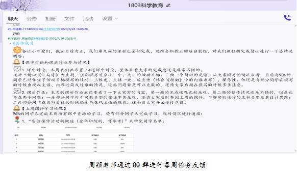 梁爽老师综合自己的教学实践,对自己的教学模式进行不断地调整与更新,从前期的云课堂发布任务向QQ直播和云课堂结合的方式转变,通过发布学习资源、课中讨论和作业的答疑解惑,充分利用QQ语音和云课堂的优势,帮助学生明确每节课的学习目标及重点,每次课程结束之后会对学生的任务完成情况进行及时的反馈与评价,以期提高学生的学习积极性和参与度。