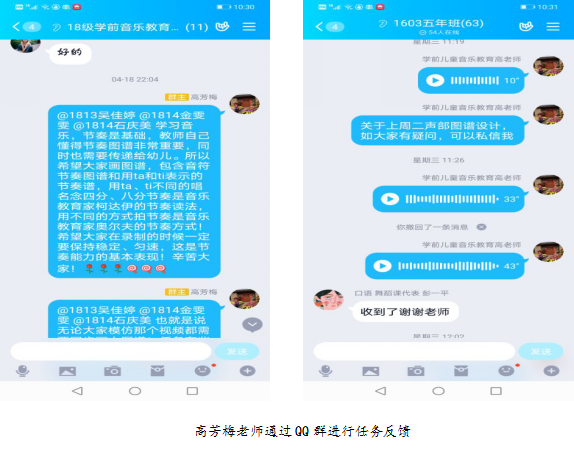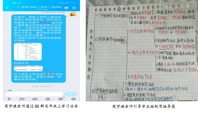 在疫情背景下,传统的线下教学变成了完全线上的教学模式,这对老师们的教学提出了一定的挑战,但老师们的教学设计和教学组织却并未松懈,而是结合自己的课程性质,对传统教学模式进行了调整与创新。首先,在教学资源保障方面,老师们通过录制操作视频、收集和购买幼儿园优质课程资源、发送教材补充资源等方式,确保学生居家依然有充足的学习资源。其次,在教学组织方面,老师们一方面采用云课堂、腾讯课堂、QQ群课堂等多种方式,发布学习任务、组织线上讨论、直播讲解和分析,满足学生理论知识学习的需要。另一方面采用腾讯课堂、QQ群课堂直播等方式,进行直播试教、直播示范和评价,满足学生实践技能的需要。最后,在教学效果保障方面,老师们采用云课堂和QQ群相结合的方式,通过云课堂发布作业,通过QQ群引导学生分析和评价作业,课后要求学生对作业进行优化与完善,在“计划-实施-检查-优化”中,不断提升学生活动设计、实施与反思的能力。对于知识掌握较慢的学生,老师们则通过QQ一对一辅导,帮助学生答疑解惑,确保所有的学生都能学有所获、学有所成。总体来说,在过去12周,教法教研室的教学情况良好,学生参与度热情较高。