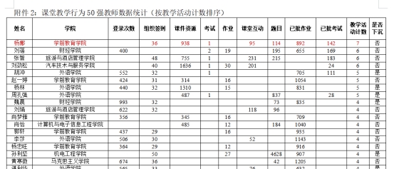 据前期学校职教云后台数据统计,杨娜老师的课堂教学行为全校排名第一。