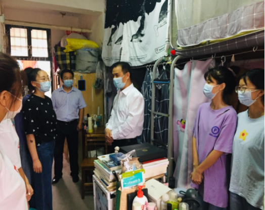 调研中,邓校长查看了学生食堂的卫生环境情况和早餐供应情况,对公共场所体温检测和出入登记、重点区域清洁消毒、食品的卫生与安全等方面进行了仔细询问和深入了解,十分关心学生在校期间的民生问题。邓校长一行还走访了学前教育学院学前1809班的每一间学生寝室,亲切问候和关怀学生,询问寝室住宿水电、空调、网络等方面有无困难,对学生寝室卫生和寝室文化建设给予了充分肯定。他表示,当前疫情防控工作已经进入常态化,同学们意识上要重视,坚持要做好体温一日三测工作,有困难及时向学院领导老师汇报,教育学生认真做好防疫防护,保护好自己的安全就是对自己负责、对家长负责、对学校负责、对国家负责。