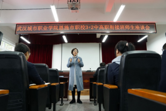 在紧接下来的武汉城市职业学院恩施市职校3+2中高职衔接班师生座谈会上,武汉城市职业学院学前教育学院卓萍院长宣传了国家精准扶贫对学生们的利好政策, 同时强调扶贫必扶智,希望这种形式能让大家接受到更良好的教育,真正实现教育扶贫。同时,她在座谈会中,调查和了解学生的实际课程开设情况和学习掌握情况,希望大家好好学习,不断提升自身素质,对学生们的发展寄予厚望。