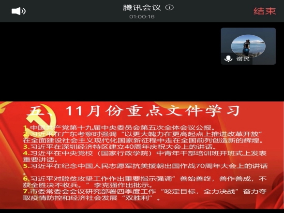 根据中共武汉市委组织部下发的全市11月份党支部主题党日重点学习内容提示,学前教师第一党支部于2020年11月13日晚上八点召开十一月支部主题党日活动,本次会议使用腾讯会议APP,采取线上方式开展此次主题党日活动。会议由支部书记谢民主持。