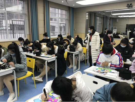 接下来的考试从8:30持续到12:00。首先进行美术考试,美术考核内容是命题简笔画,考生准备充分,在20分钟的时间内熟练地完成了美工作品,色彩、构图上都较饱满。