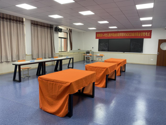 在理论考试考场,学院提前完成所有电脑技能、软件测试,每个考场都预留10台电脑以备突发情况发生。在实操考场里,学院特别定制了带有武汉城市职业学院logo的操作台桌布,从物品、台签到统分老师、志愿者的安排都精心摆放、严格筛选,营造温暖而严肃的考场氛围。