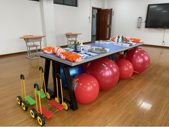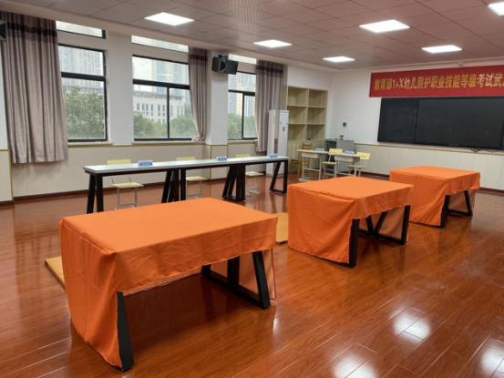 学院按照严格第三方要求,安排候考室、物料间、考场并完成整体布置。在候考室以3人为一组进行划分,并为考生们准备好口罩、酒精等防疫物品。在物料间,按照湖南金职伟业母婴护理有限公司的要求,每个物料间共准备4套物料。面对繁杂物料,学院根据事先抽取的4道早期发展题目和2道卫生保健题目,请1+X幼儿照护职业技能等级证书(中级)培训教师老师全程指导,有序摆放了幼儿仿真模型、大龙球、羊角球、蹦床、平衡脚踏车、海洋球、体温表、弯盘、纱布、消毒液纱布、测血压计、听诊器、碘酒、棉签、手消毒剂、记录本和笔等考试所需物料,确保物料完整、有序。