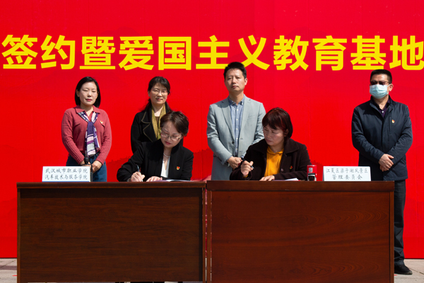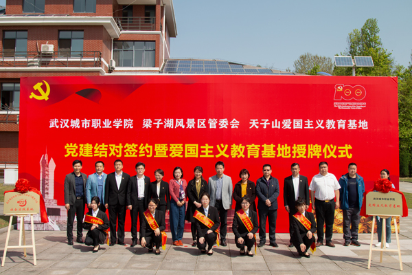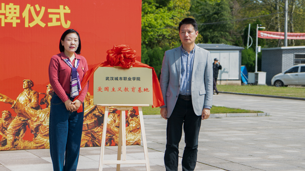 武汉城市职业学院党委宣传部常务副部长杜娟、江夏梁子湖风景区管理委员会主任刘俊共同为武汉城市职业学院爱国主义教育基地授牌。