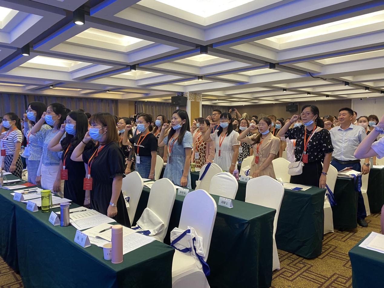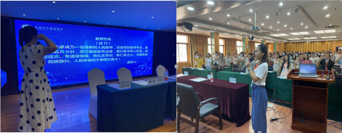 最后全体新入职幼儿园教师庄严宣誓:“我志愿成为一名光荣的人民教师,忠诚党的教育事业,遵循党的教育方针,遵守国家教育法律,履行教书育人职责,有理想信念,有道德情操,有扎实学识,有仁爱之心,为国家富强、民族振兴、人民幸福而不懈努力奋斗!”