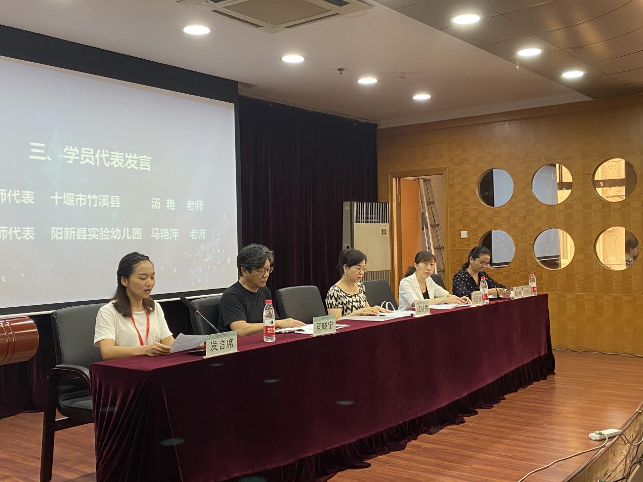 来自宜昌市幼儿园的袁书娟老师代表非学前教育专业教师专业补偿培训班全体学员发言。她表示幼儿是未来国家和民族的希望,转岗成为幼儿教师,我们深感责任重大,期待通过此次培训能真正做到学有所思、思有所得、得有所成,为胜任幼儿教师岗位奠定良好基础。