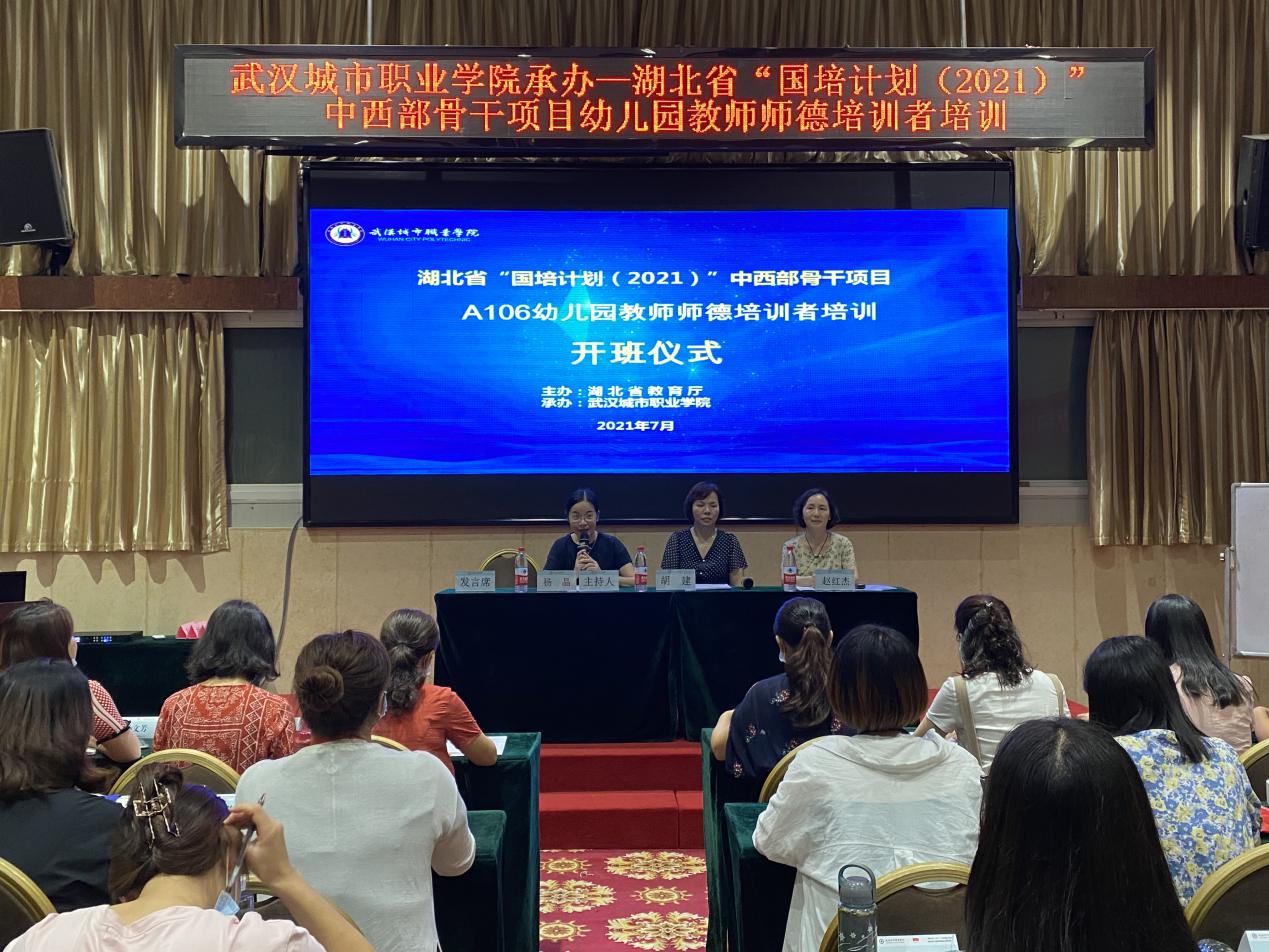 7月19日,来自湖北省内100名学员齐聚阳光128大酒店,进行为期10天的湖北省“国培计划”中西部骨干项目幼儿园教师师德培训者培训。在轻松的律动活动中,20日上午8:30在酒店会议室举行开班仪式。仪式由武汉城市职业学院继续教育学院杨晶老师主持,武汉城市职业学院继续教育学院胡建副院长、学前教育学院赵红杰主任出席开班仪式,班主任黄蔚老师、志愿者及培训相关工作人员参与仪式。