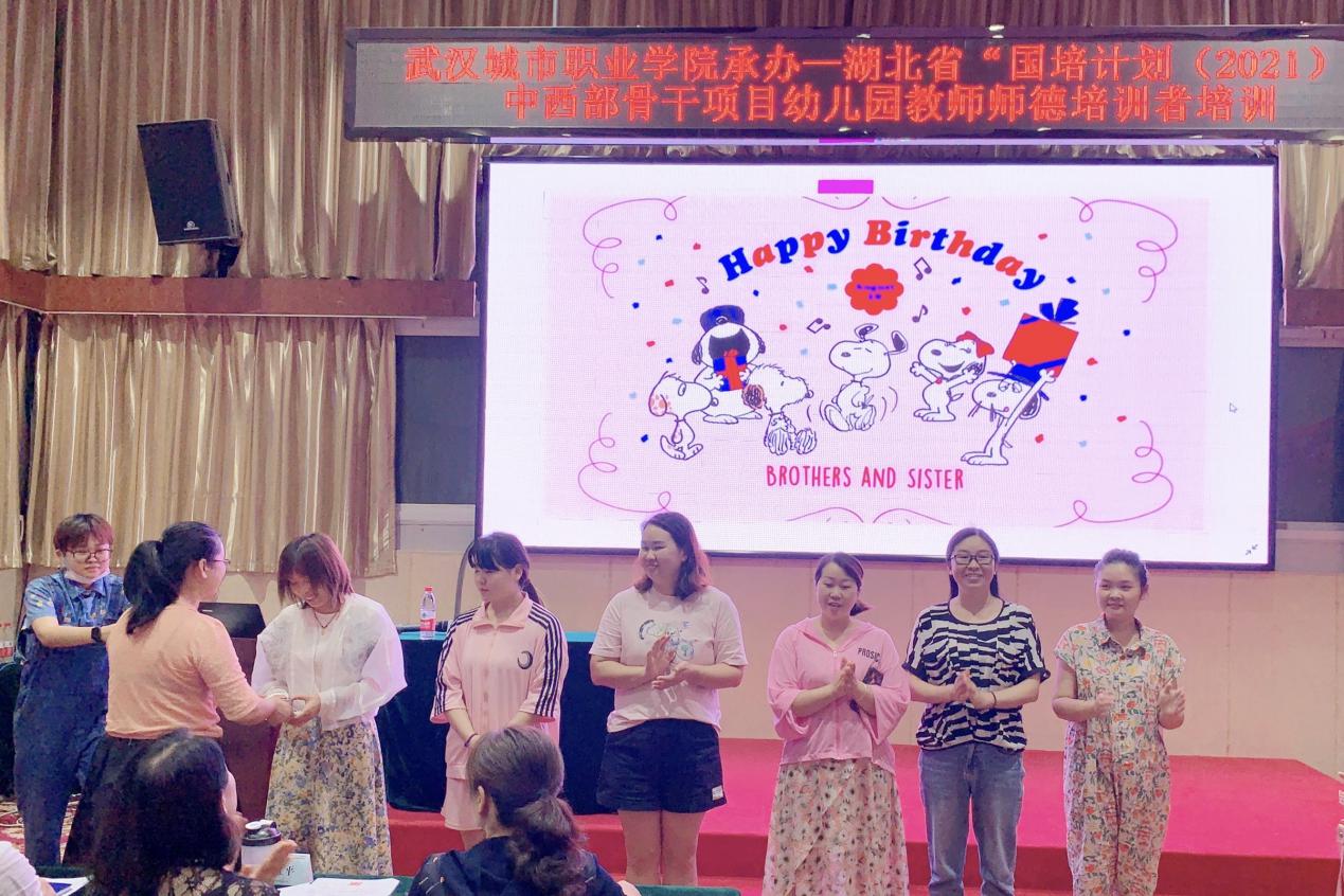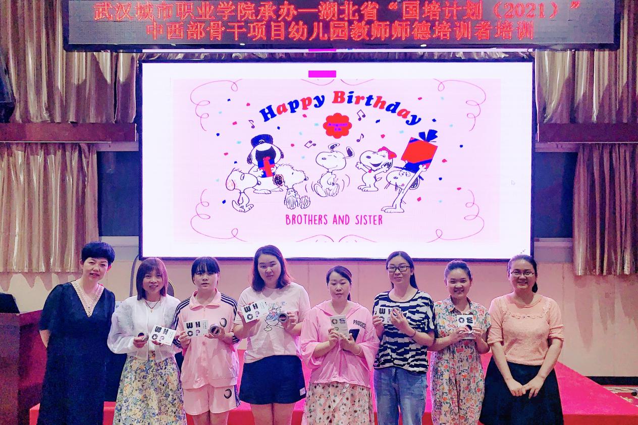 下午2:00,黄老师分别请出了孝昌县鑫乐幼儿园的刘洁萤老师、鄂州市梁子湖区太和镇中心幼儿园的陈姣老师、黄石市西塞山区星月幼儿园的刘丽华老师、阳新县金太阳幼儿园的华晓燕老师、竹溪县机关幼儿园陈艳美老师、黄石市黄石港区黄棉昌大公司幼儿园王珺老师,全体学员为她们送上了生日祝福,继续教育学院董云燕主任为她们送上了特别的生日礼物。