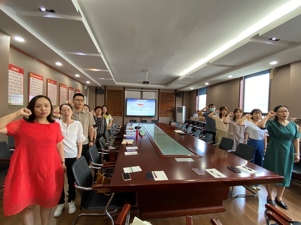 本次党日活动由学前教师第二党支部书记马豫主持。按照会议流程,组织委员杨忠旺反馈9月党费收缴和一日捐情况。接下来,学前教师第二党支部党员教师们集体重温了入党誓词。