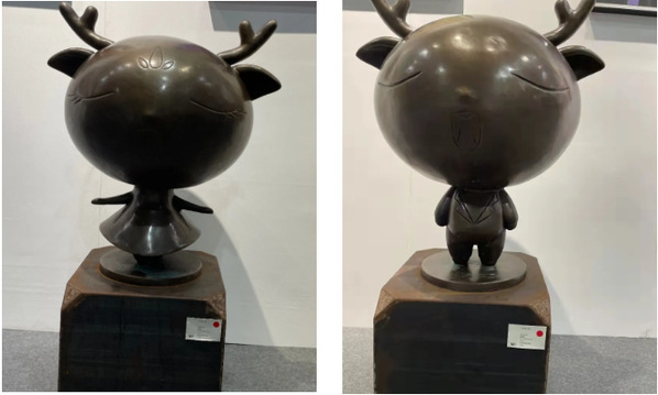由学校国家旅游商品研发中心(武汉)联合研发基地原创设计并制作的文创产品吸引了许多游客驻足拍照和观赏, 其中一对三生鹿铜雕塑更是受到游客青睐。
