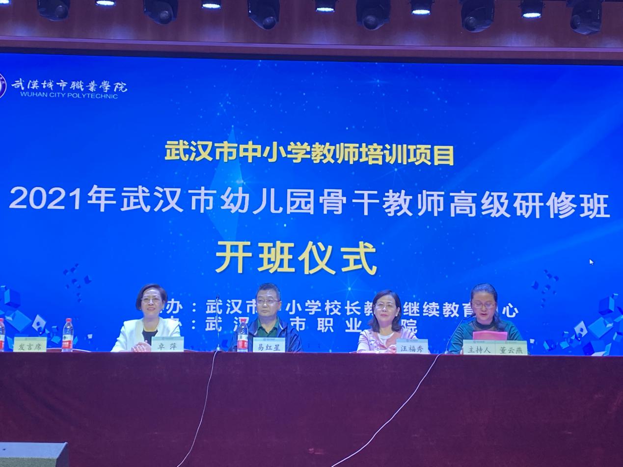 金秋十月,丹桂飘香。在丰收的季节里,10月13日上午,由武汉市中小学校长教育继续教育中主办,武汉城市职业学院承办的“2021年武汉市幼儿园骨干教师高级研修班”在武汉城市职业学院学前教育学院小礼堂举行开班仪式。在疫情防控常态化背景下,此次开班、培训采用线上教育教学模式。出席开班仪式的有武汉市中小学校长教师继续教育中心易红星教授、武汉城市职业学院学前教育学院院长卓萍教授、武汉城市职业学院继续教育学院院长汪福秀教授、湖北工业大学幼儿园学员代表吴嘉希老师,武汉城市职业学院继续教育学院主任董云燕老师主持开班仪式。