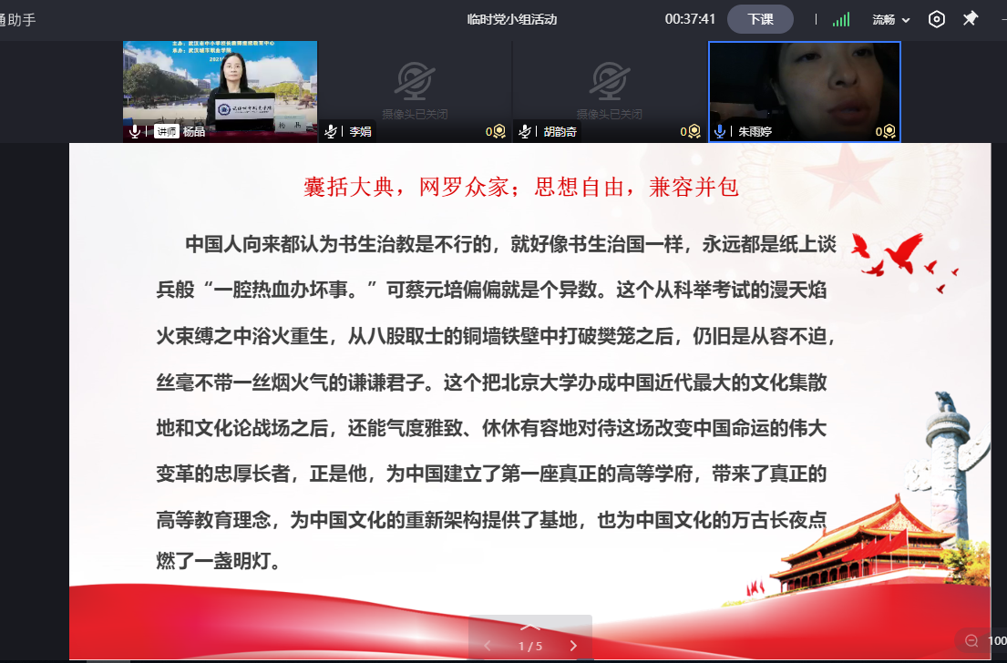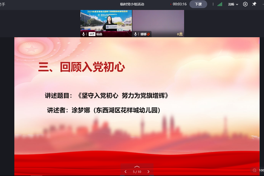 学习之余,党员老师们还开展了临时党支部支部主题党日活动,通过诵读党章、忆初心、党史学习、分享教育楷模故事和书籍等方式,接受政治洗礼,致敬教书育人楷模,落实立德树人根本任务。