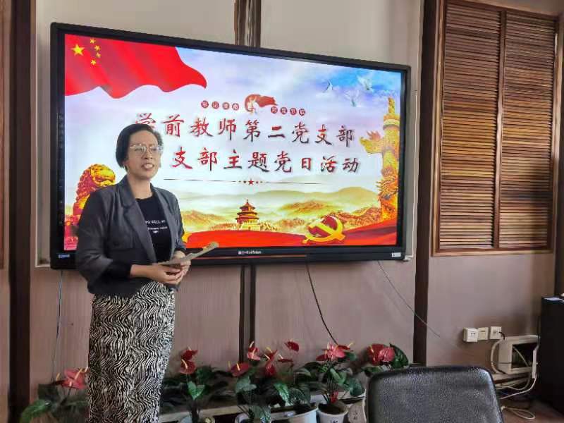 本次党日活动由学前教师第二党支部书记马豫主持。按照会议流程,组织委员杨忠旺反馈9月党费收缴和一日捐情况。接下来,学前教师第二党支部党员教师们集体重温了入党誓词。