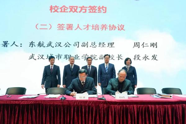 武汉城市职业学院副校长段永发和东航武汉公司副总经理周仁刚签署人才培养协议。