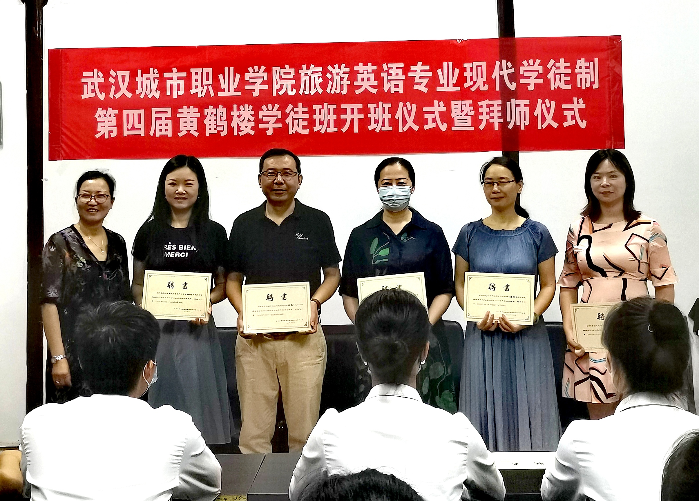 黄鹤楼假日国际旅行社有限公司张总、周经理和学徒制师傅们,武汉城市职业学院外语学院吴院长、张院长、旅游英语教研室各指导老师们,参加了拜师仪式。