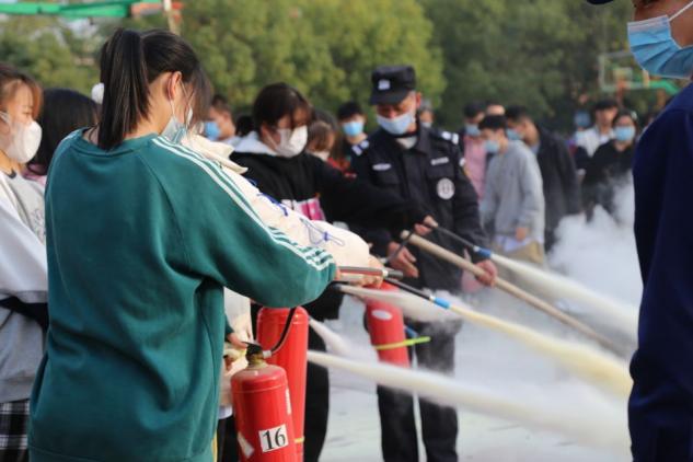 在认真仔细听消防员讲述及观摩后,学生亲自体验了现场灭火的过程,面对熊熊燃烧的油盆,同学们都表现的十分冷静,在消防员的指导下,按照灭火器的使用步骤、方法和注意事项将熊熊燃烧的浓烟大火扑灭。