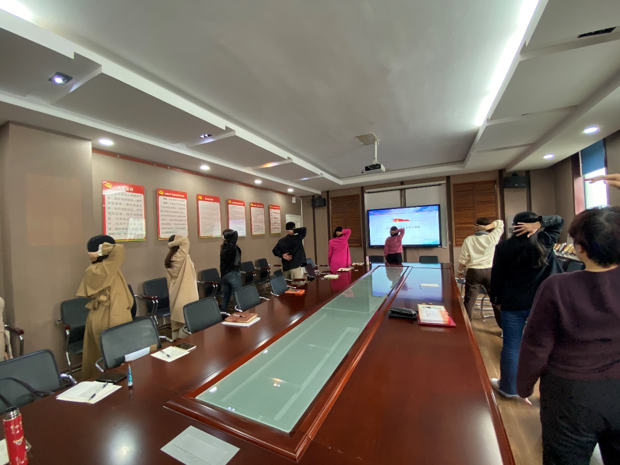 第六项创新活动为支部马豫同志带领大家做保健操。马豫同志提出,近段时间,各位党员工作任务重,事务繁杂,要注意身体,尤其是注意颈椎部位的保健,希望能通过保健操带领大家放松身心,更好地投入自己的工作中。接下来,马豫同志带领大家进行了保健操训练,支部党员们都兴致极高地投入这项有益的创新活动练习中。