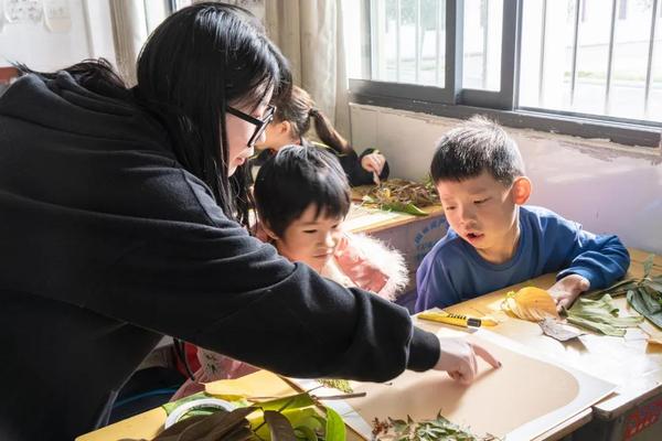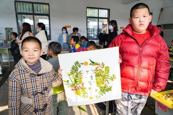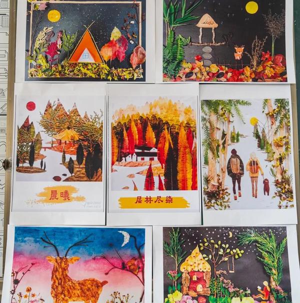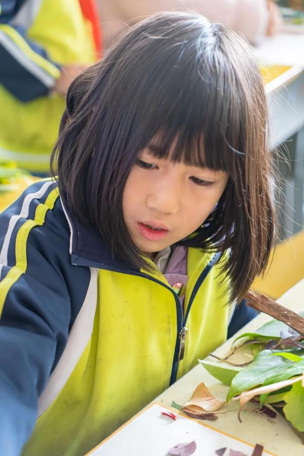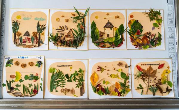 树叶拼贴课逐渐步入尾声,孩子们在座位上纷纷拿着自己完成的作品,眼中散出了自信骄傲的光芒。