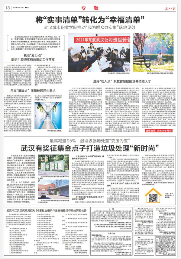 主动服务区域经济社会文化事业发展,解决师生、社区、群众 “急难”问题。党史学习教育开展以来,武汉城市职业学院紧紧围绕区域高质量发展、围绕师生群众需求,秉持为党育人、为国育才的初心使命,在办好教育、打造办学特色的同时积极服务社会。扎实开展“我为群众办实事”实践活动,将“实事清单”转化为“幸福清单”,推动党史学习教育更有成效。