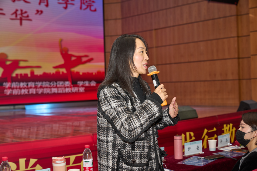 学前教育学院党总支书记张沛带大家思考“舞蹈对我们意味着什么”,她结合自身求学、工作经历向现场师生分享舞蹈的三个意味。一是判断与选择,小到动作大到处世,遇事会判断,并能够做出正确的选择;二是善良,成长道路上同学们要坚守初心,坚持善良,感恩前行;三是幸运,同学们生逢盛世,应看到世界的美好,对未来充满信心,珍惜在学校学习机会,要坚信没有一蹴而就的成就,哪怕未来布满荆棘,也要目标明确,勇敢前行。