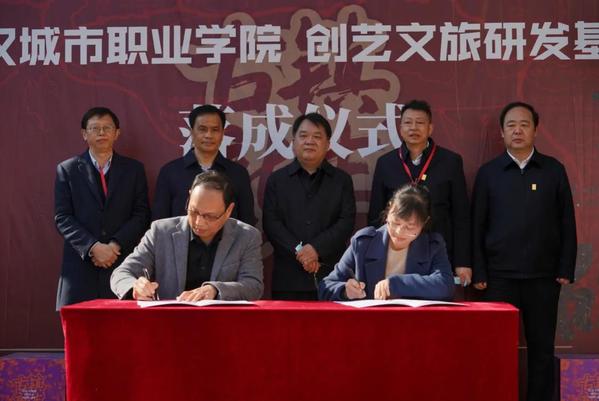 ▲学校副校长叶学文与赤壁市政府副市长甘志宝与签署了《乡村振兴文化共建战略合作协议》