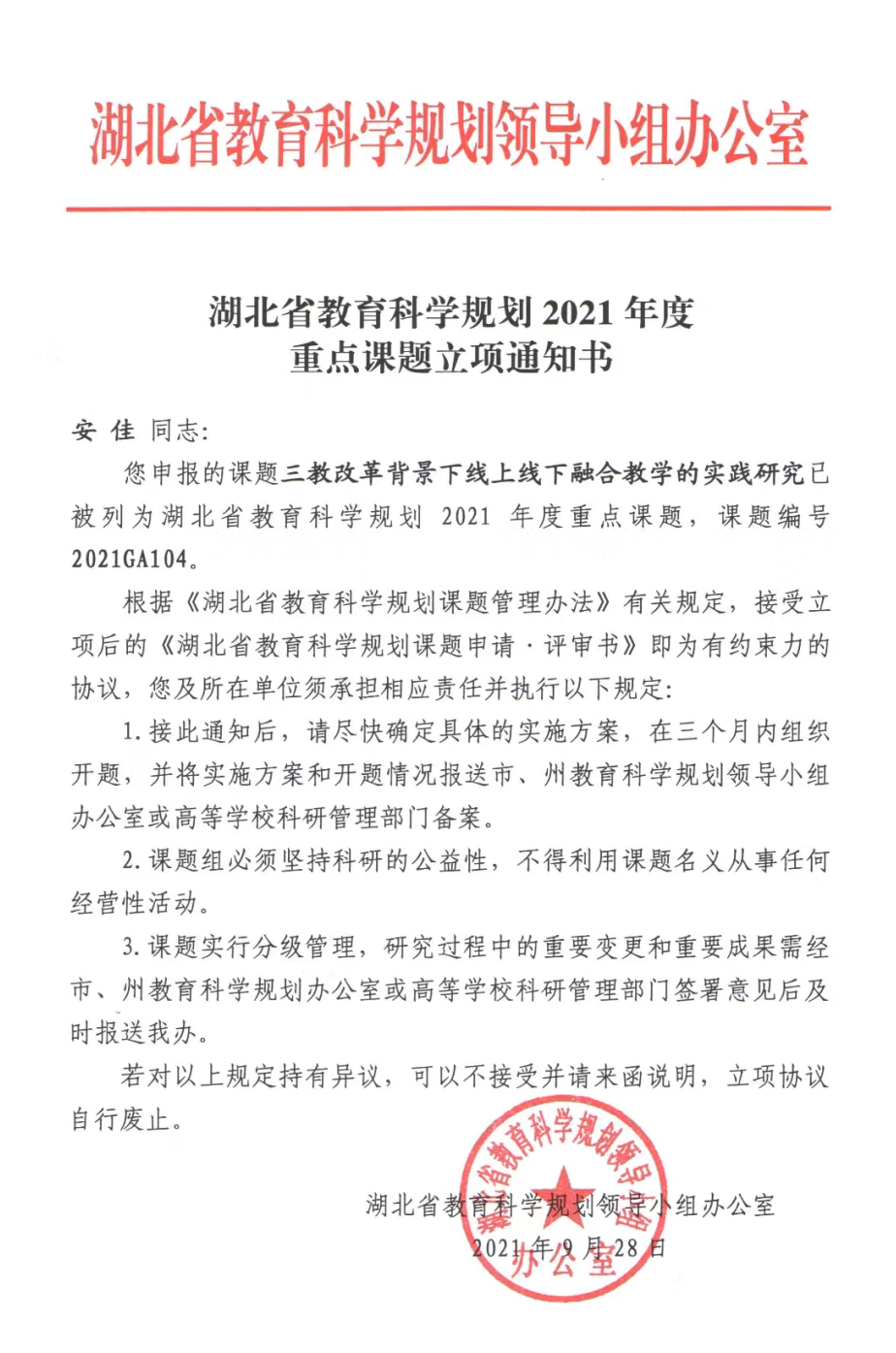近日,由武汉城市职业学院学前教育学院安佳老师主持,马豫、陈骏驹、郭梦文老师共同参与申报的《三教改革背景下线上线下融合教学的实践研究——以学前教育专业舞蹈教学为例》(课题批准号:2021GA104)获批湖北省教育科学规划重点项目。