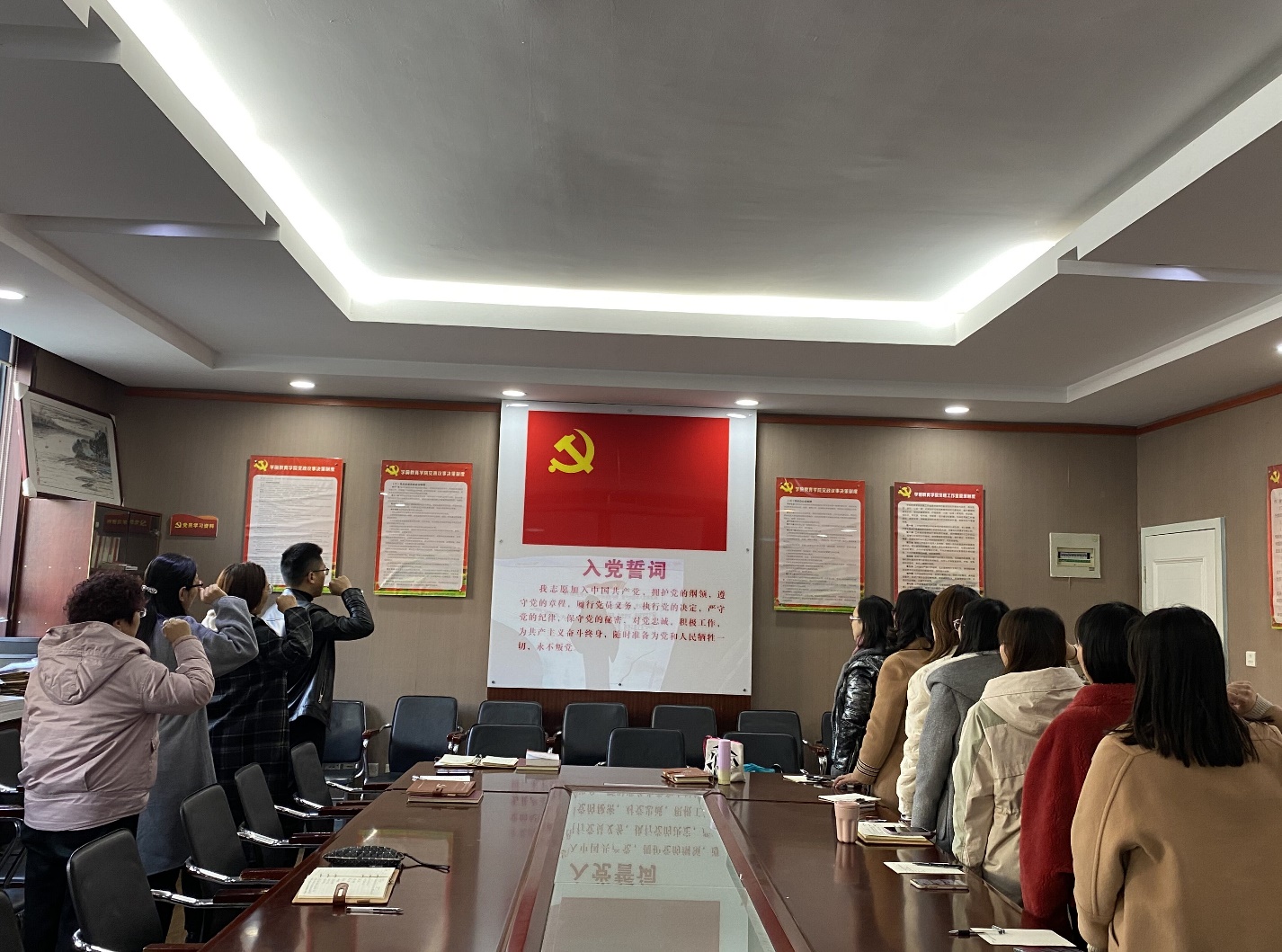 本次党日活动由学前教师第二党支部书记马豫主持。按照会议流程,支部副书记龙宇反馈12月党费收缴和一日捐情况。接下来,学前教师第二党支部党员教师们集体重温了入党誓词。