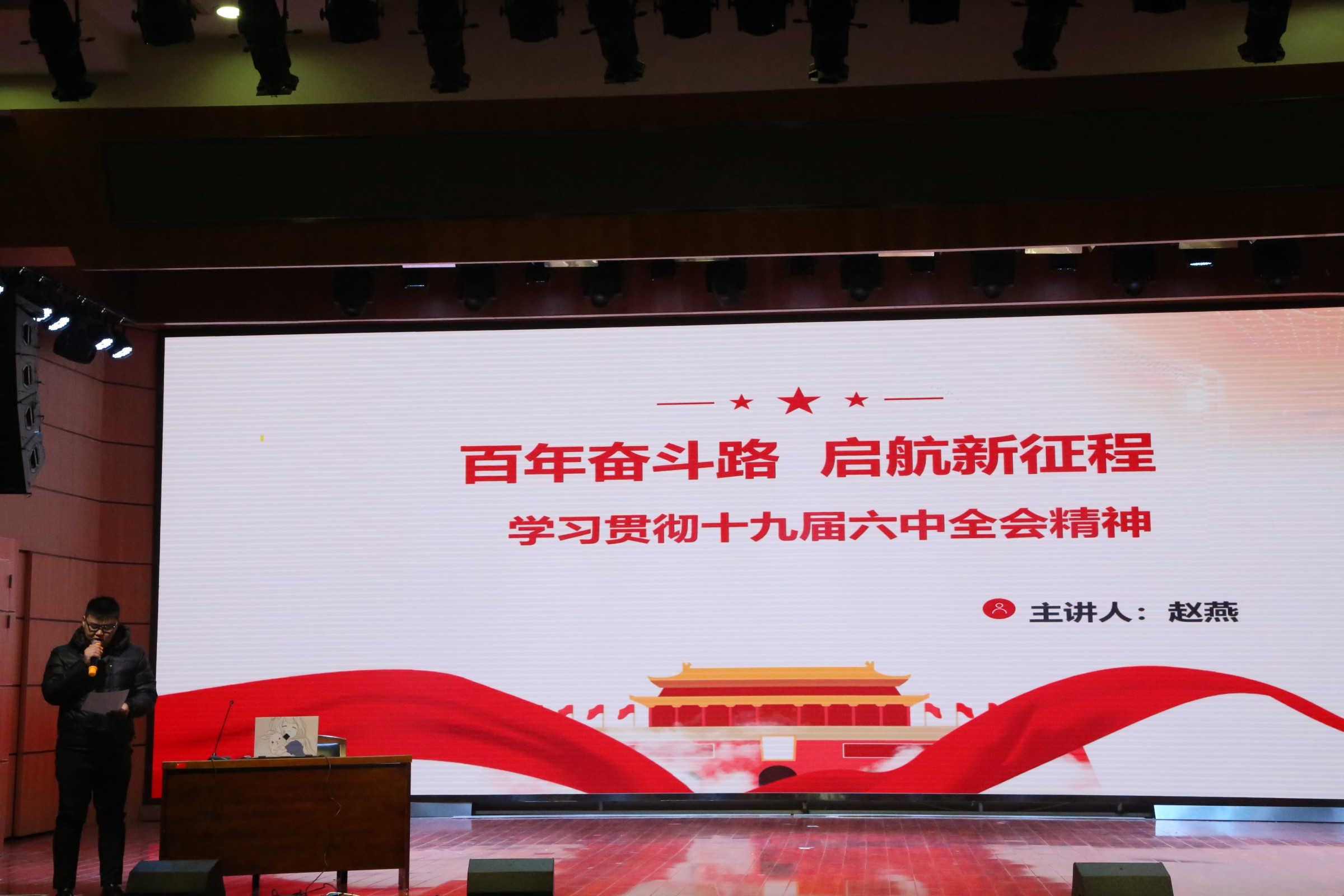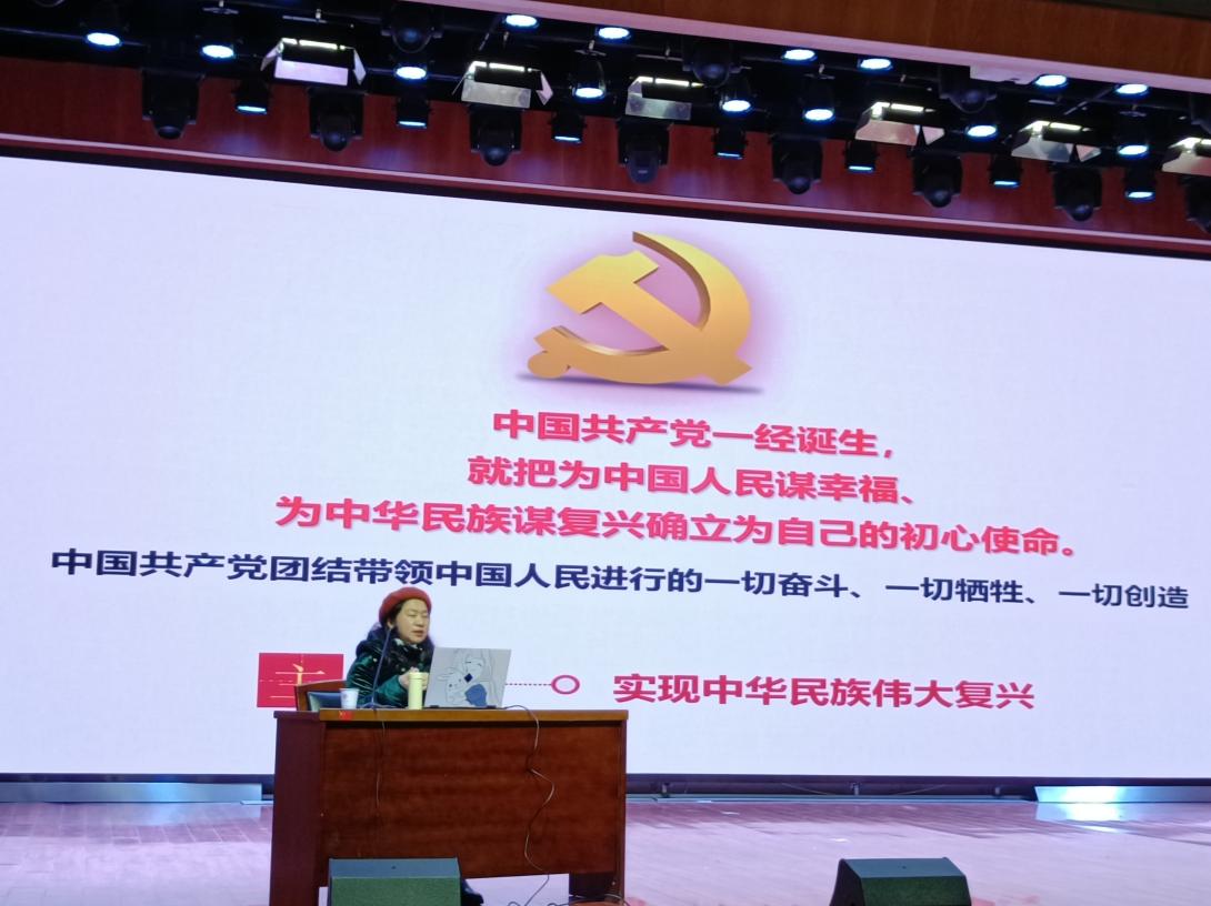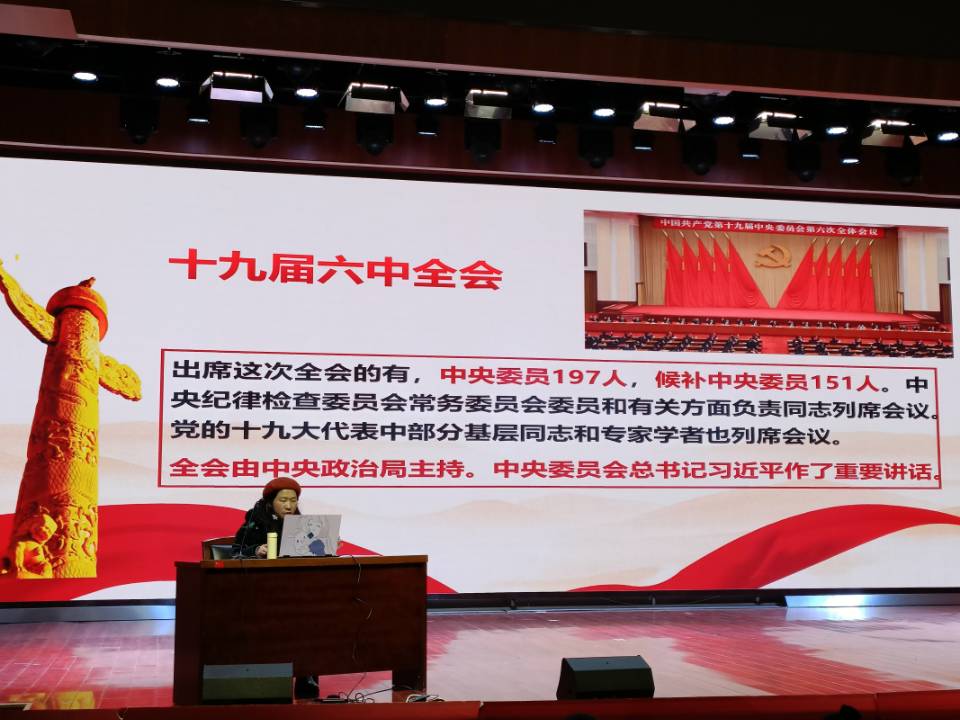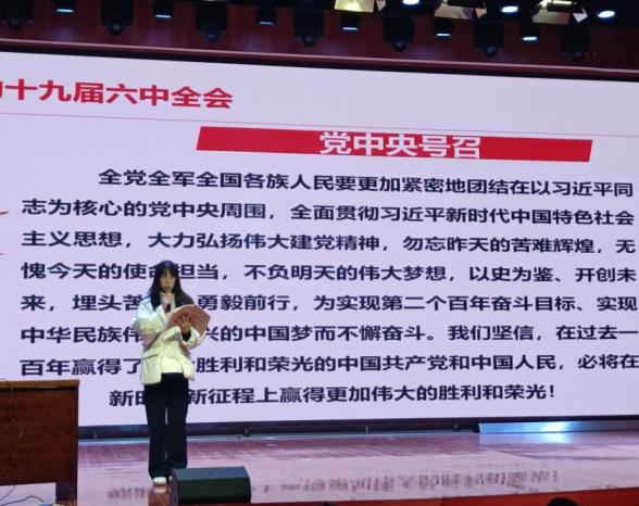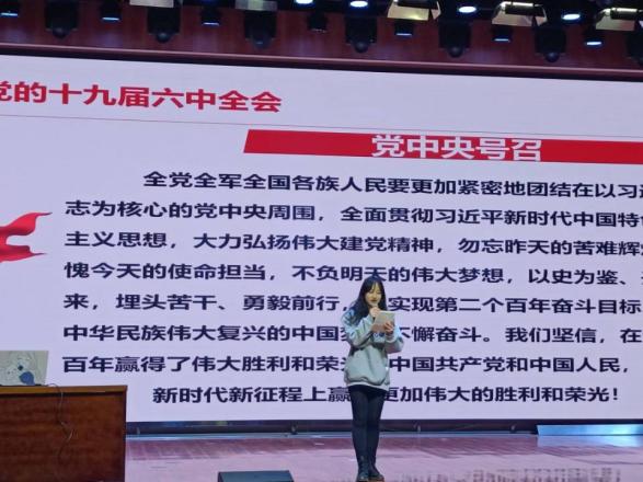 赵燕老师以“百年奋斗路,启航新征程”为主题,进行了对党的十九届六中全会精神的专题报告。赵燕老师强调,党的十九届六中全会是在重要历史关头召开的一次具有重大历史意义的会议,审议并通过了《中共中央关于党的百年奋斗重大成就和历史经验的决议》,不仅对党和国家发展有重大指导意义,也对广大青年学生提出了统一思想、统一意志、统一行动的更高要求。