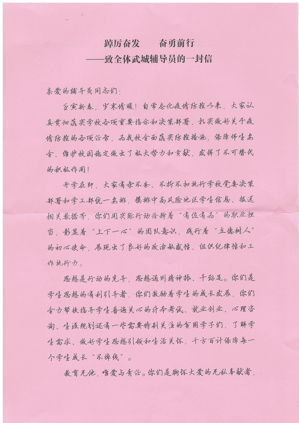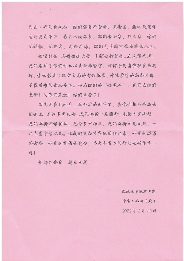 临近新学期开学,学工部从关心一线辅导员队伍出发,根据工作需要开展暖心行动,为全体辅导员老师准备了口罩、消毒酒精、记录本在内的暖心包,同时为表达关心和鼓舞士气,争取精神物质双丰收,为全体辅导员致上一封温情的书信。我校全体学工同仁将按照各项要求,提前谋划、精心组织,扎实做好学生开学返校及其他各项工作,确保新学期开学平稳有序。