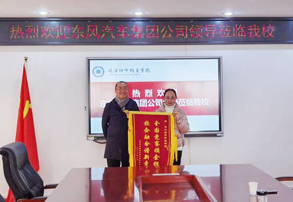 洪传龙代表东风汽车集团公司培训中心向我校赠送了锦旗,以感谢我校在数控技术领军人才研修、新技师培训及全国行业职业技能竞赛中为东风汽车集团学员提供的优质培训服务。