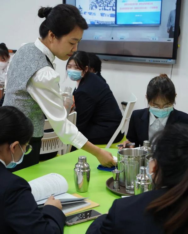 课堂以回顾鸡尾酒百年历史开始,落脚到本次课程的主题:鸡尾酒制作方法——摇和法。两校主讲老师按照新识探索、实践操练、成果评估、课堂小结的教学环节共同开展同步课堂的实施。