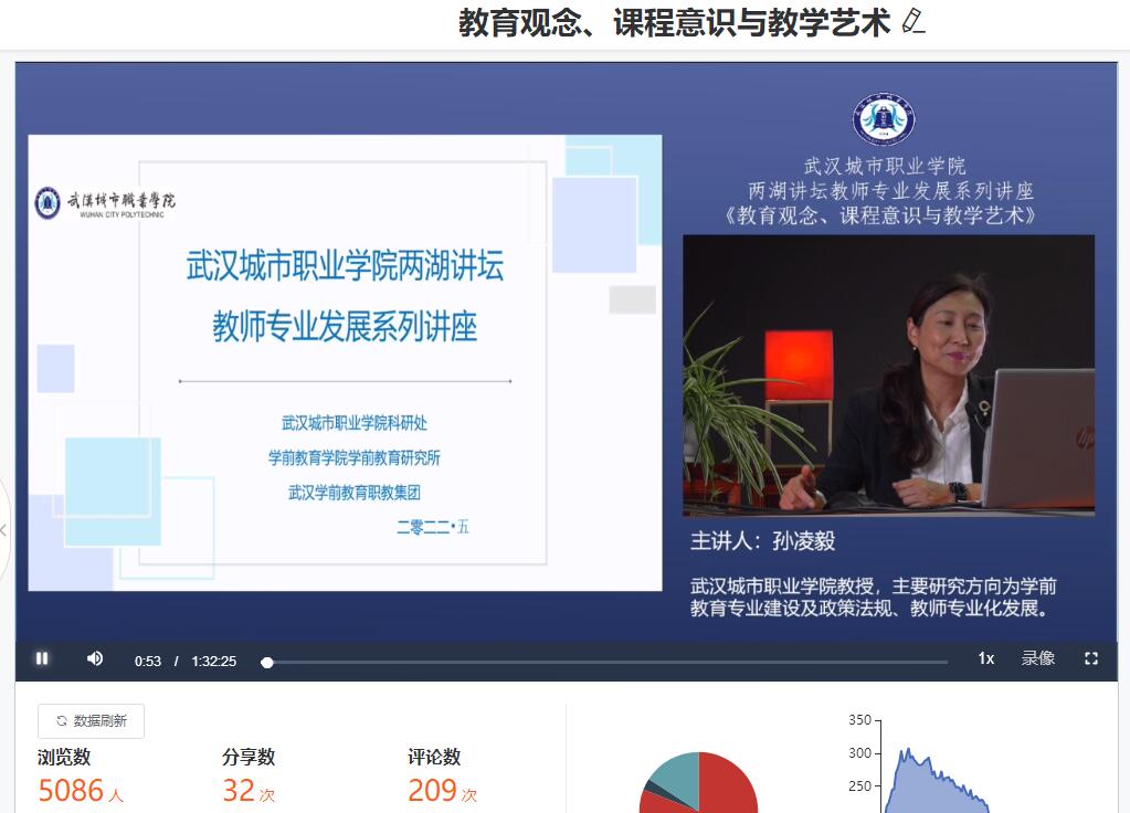 2022年5月19日下午2:30,由学校科研处、学前教育学院学前教育研究所、武汉学前教育职教集团联合举办的教师专业发展系列讲座由教授工作室孙凌毅教授拉开了序幕,进行了第一场《教育观念、课程意识与教学艺术》精彩讲座。本次讲座别开生面,以线上线下联动形式进行,在对学前教育学院全体教师线下讲座的同时,面对新疆博州高等职业技术学院教育学院、湖北省中高职学前教育专业、武汉学前教育职教集团各位老师线上直播,共约6000余位老师参加了线上学习。本次活动由武汉城市职业学院学前教育学院学前教育研究所所长康玲教授主持。