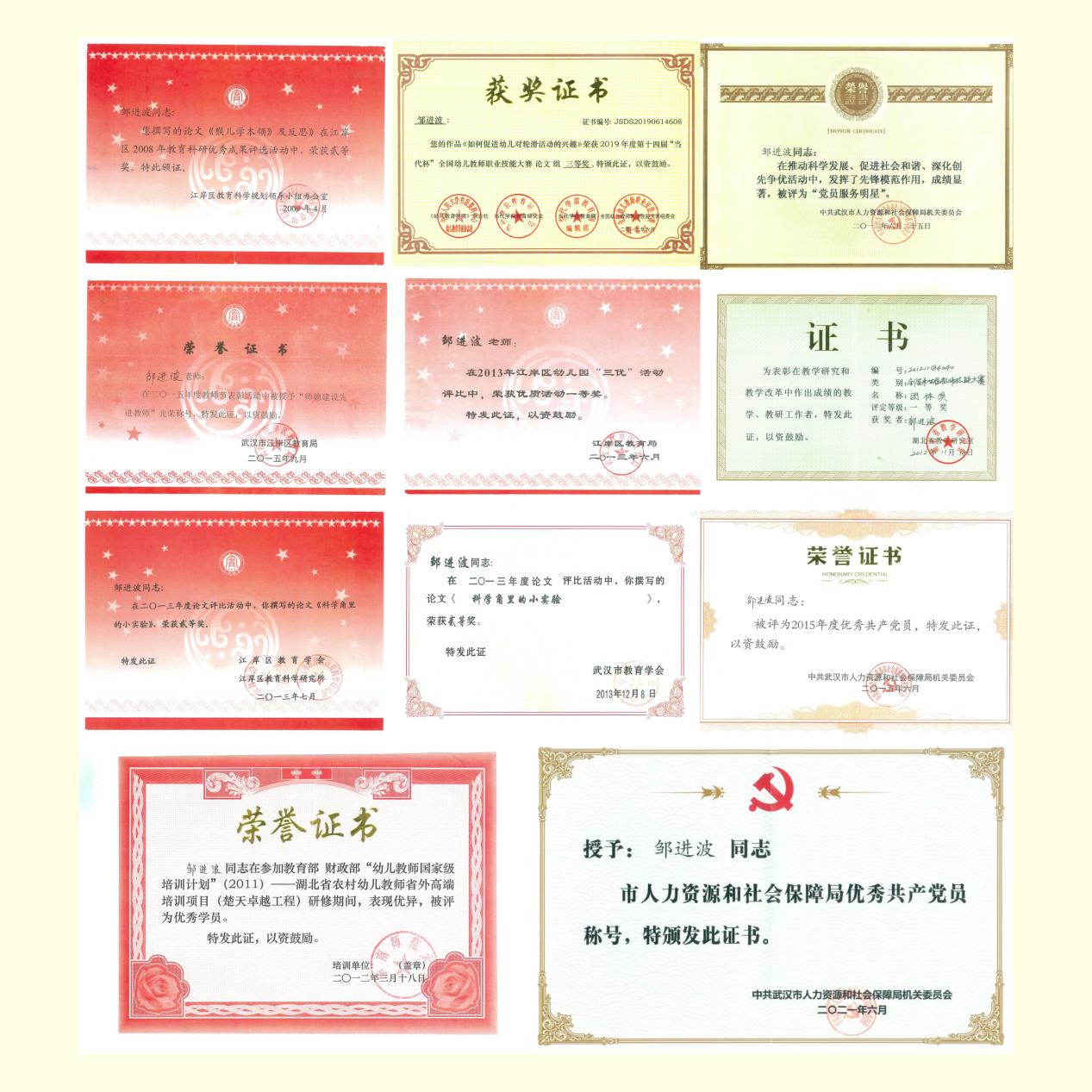 邹进波,2007年毕业于江汉大学实验师范学院(现武汉城市职业学院学前教育学院),现就职于武汉市直属机关曙光幼儿园,担任幼儿园党支部组织委员、行政部长。