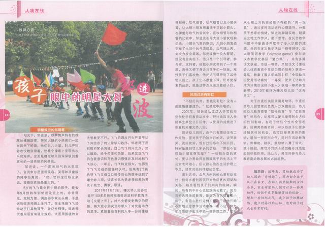邹进波是武汉城市职业学院学前教育学院众多毕业生中的优秀代表。近年来,学院多措并举,着力提升人才培养质量,尤其是在男幼师的培养上,学院大力实施“男幼师培育关爱工程”,从学生进校开始,就帮助其制定职业规划,明确定位,找准目标和今后努力方向;在课程设置和专业学习上,因人而异,因材施教,充分发挥男幼师从教具有的性别特色和优势,帮助其建立专业自信。通过一系列举措,学院在男幼师的培养上喜结硕果,先后涌现出邹进波、吴炎坤、陈潘、聂凯伦、程超等一大批先进典型。
