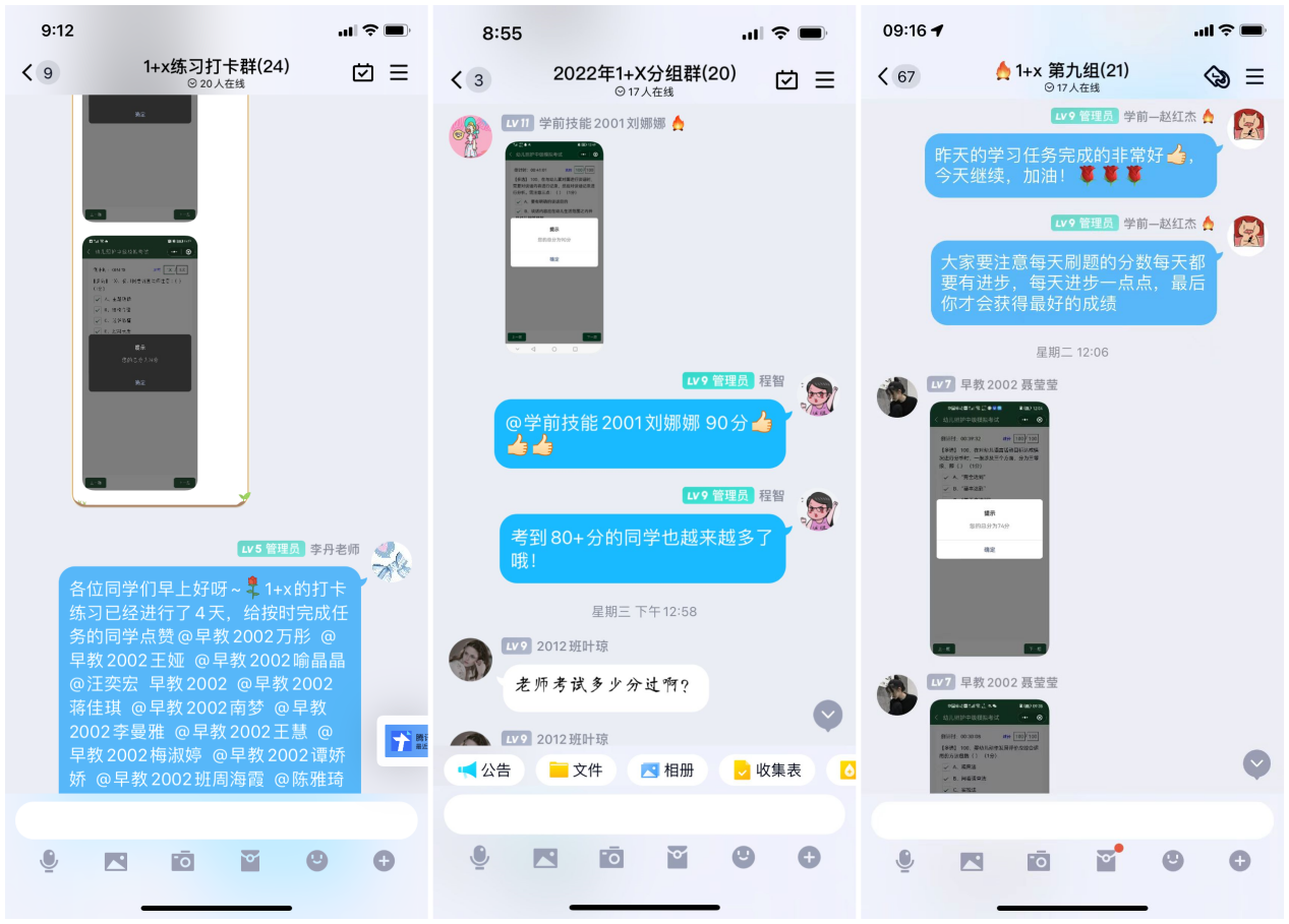 针对理论基础知识部分,学院根据学生班级分组,安排指导老师督促、指导学生每天刷题,旨在促进学生巩固知识点,形成理论逻辑记忆,提升考核分数。
