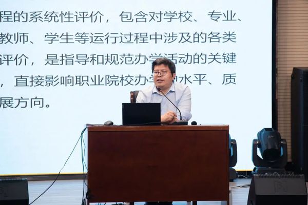 湖北省教育科学研究院刘群副研究员在武汉城市职业学院南区财经学院报告厅作了主题为“职业院校办学能力的监测与评估”的现场专题报告。分析了职业教育办学评价四个阶段、职业院校办学评价演化的特征,并就未来发展趋势进行了展望。同时提出职业教育发展的难点、痛点问题,并与现场与会人员进行互动。