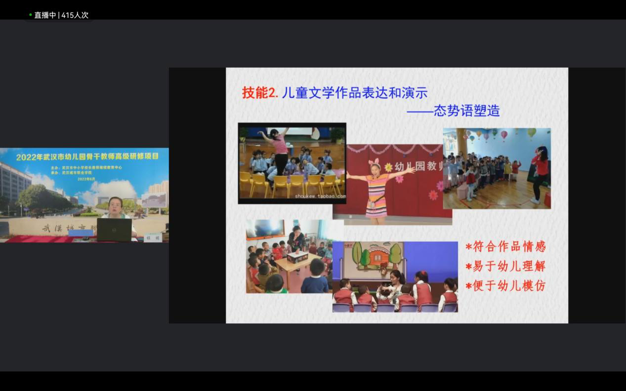 幼儿园音乐活动中,歌唱是幼儿表达对歌曲理解的一种方式,但是如何带领幼儿更好的表达歌曲需要教师具备一定的演唱技巧和艺术素养,武汉城市职业学院何晶老师为我们带来的《幼儿园歌唱活动的开展与实践》培训带领我们掌握了基本的发声和演唱技巧,用了“气泡音”、“轻咳嗽”、“辣椒皮”等通俗易懂的叫法带领学员们进行了喉舌分离训练、共鸣腔训练,充满了趣味和实用性,为教师在日后的音乐活动开展中引导幼儿更健康的发声奠定了坚实的基础。