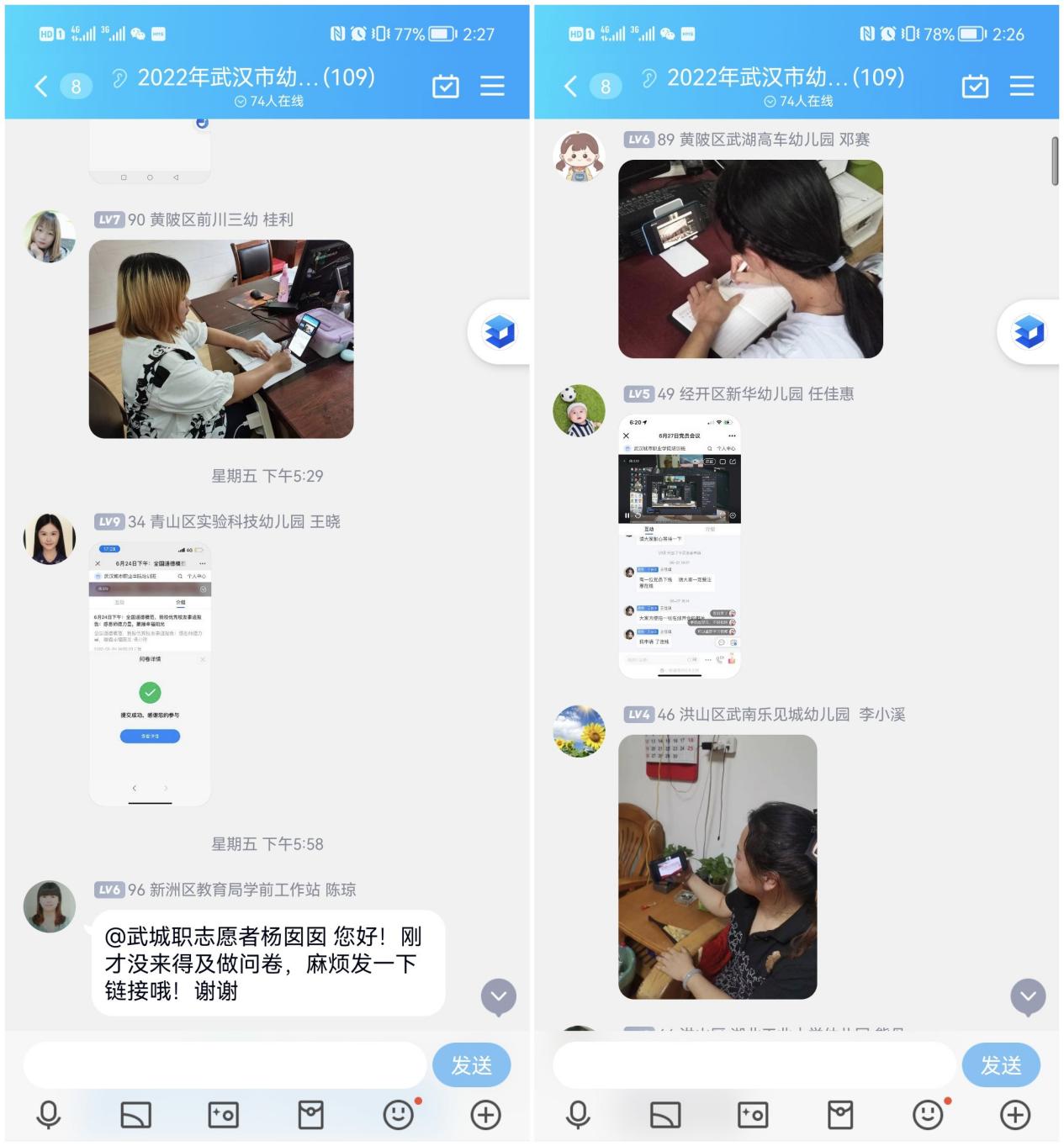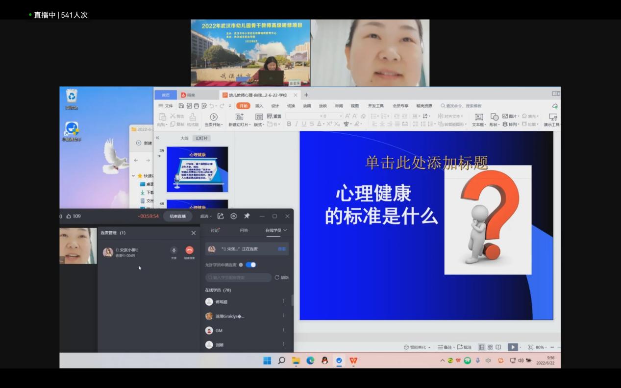 在培训的过程中,班主任和志愿者特别注重学员们的劳逸结合。 每次休息时,都会安排学员来领老师们做课件放松操,让学员们在放松的同时也展示了自己。在课堂互动环节,学员们抓紧时间和老师连线互动,评课总结,积极和专家交流、分享。相信参加此次培训的学员老师们一定会快速的成长起来,为武汉市学前教育事业贡献自己的力量!