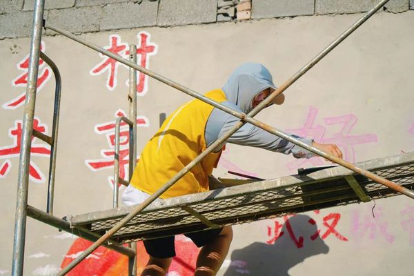 在墙绘活动当天,天降大雨,为了如期完成任务,实践队员们身披雨衣,冒着大雨对墙面进行绘画,在朦胧中一笔一划勾勒出群山的轮廓,在合作中一点一点朝着共同的目标前进。斧不止则薪多。墙绘任务正如期进行着,在完成的那天一定会在阳光下“熠熠生辉”。
